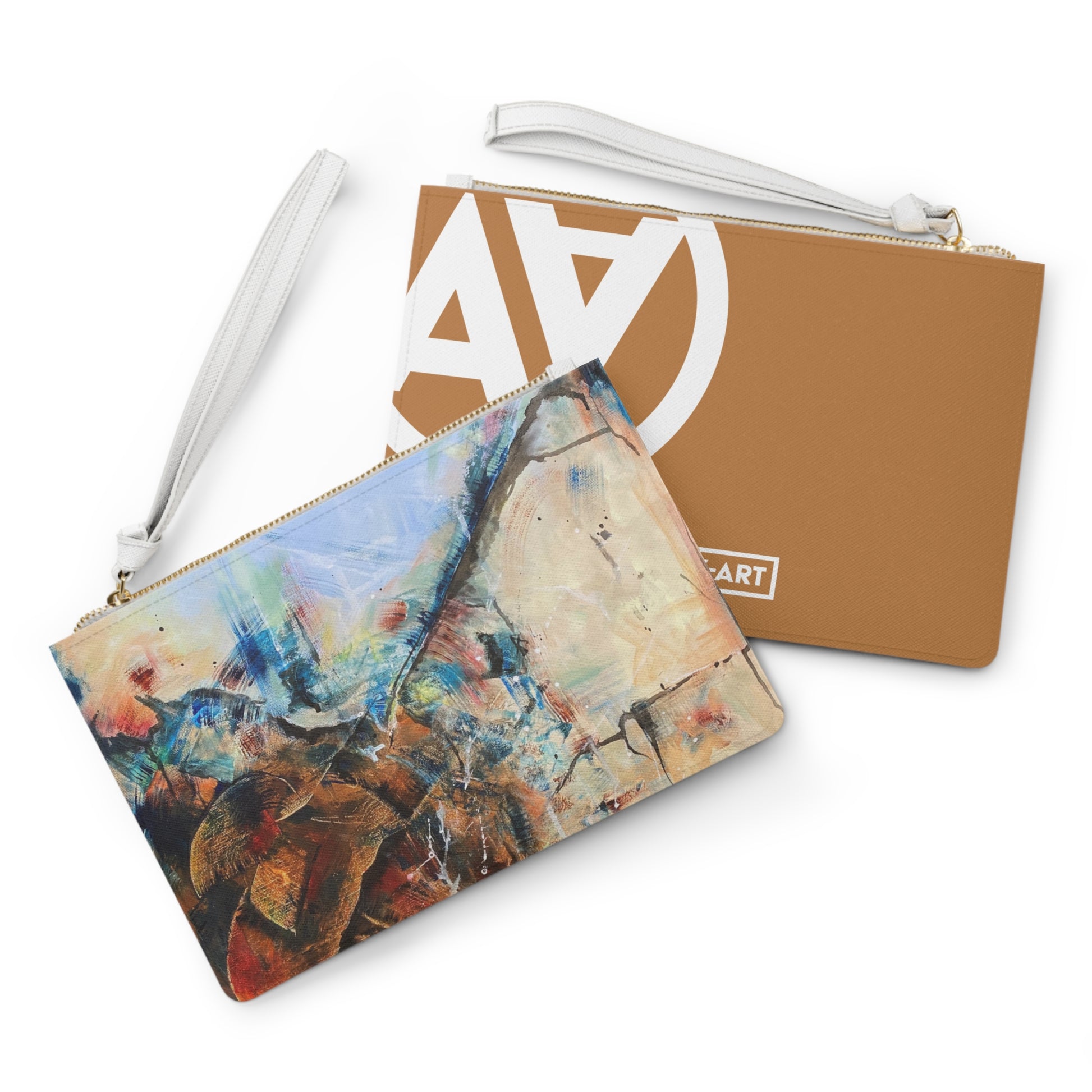 AmayzArt clutch bag featuring art by Alexandra May. Designed with a loop handle to quickly free your hands, It can hold everyday essentials such as a phone, wallet, and keys. It features a zip fastening and a fully lined internal pocket. It is made of vegan leather in the Saffiano pattern finish invented by Prada.