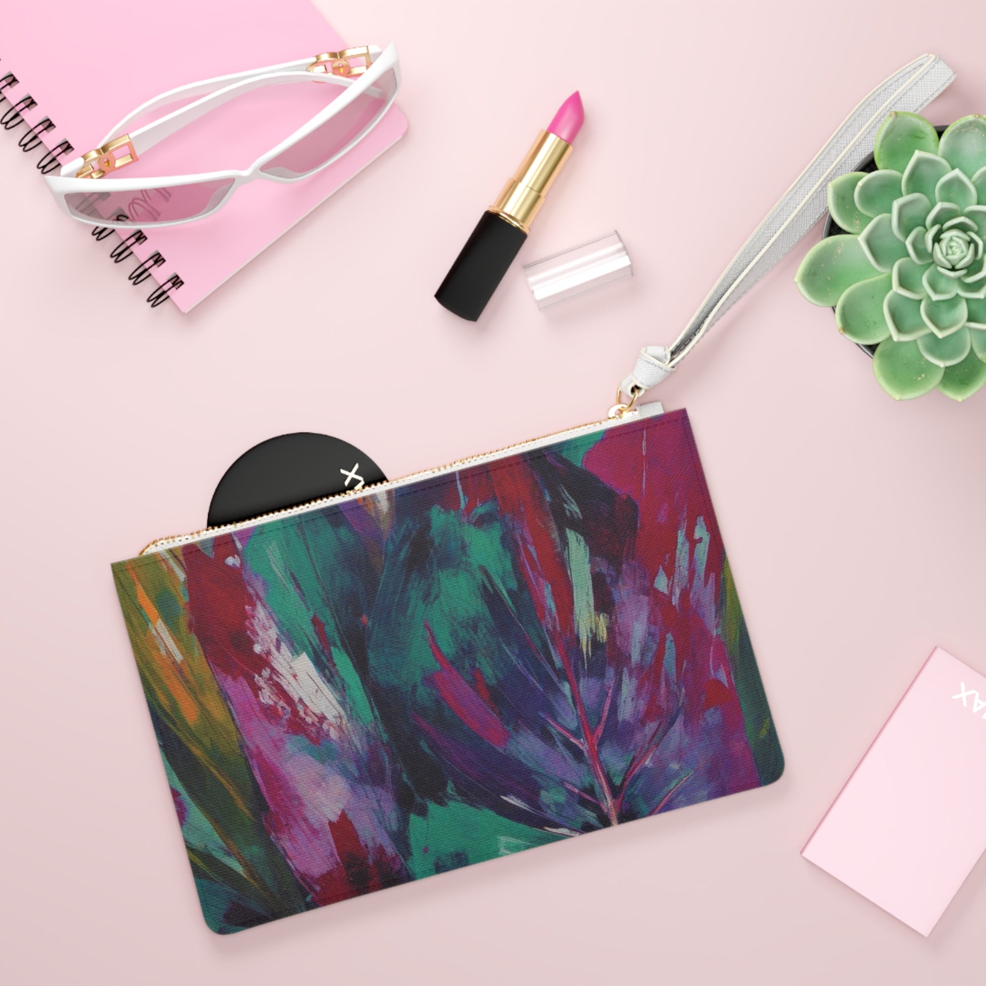 Designed with a loop handle to quickly free your hands, this artistic clutch bag is made for the fashionista on the go. It can hold everyday essentials such as a phone, wallet, and keys. It features a zip fastening and a fully lined internal pocket. It is made of vegan leather in the Saffiano pattern finish that was invented by Prada.