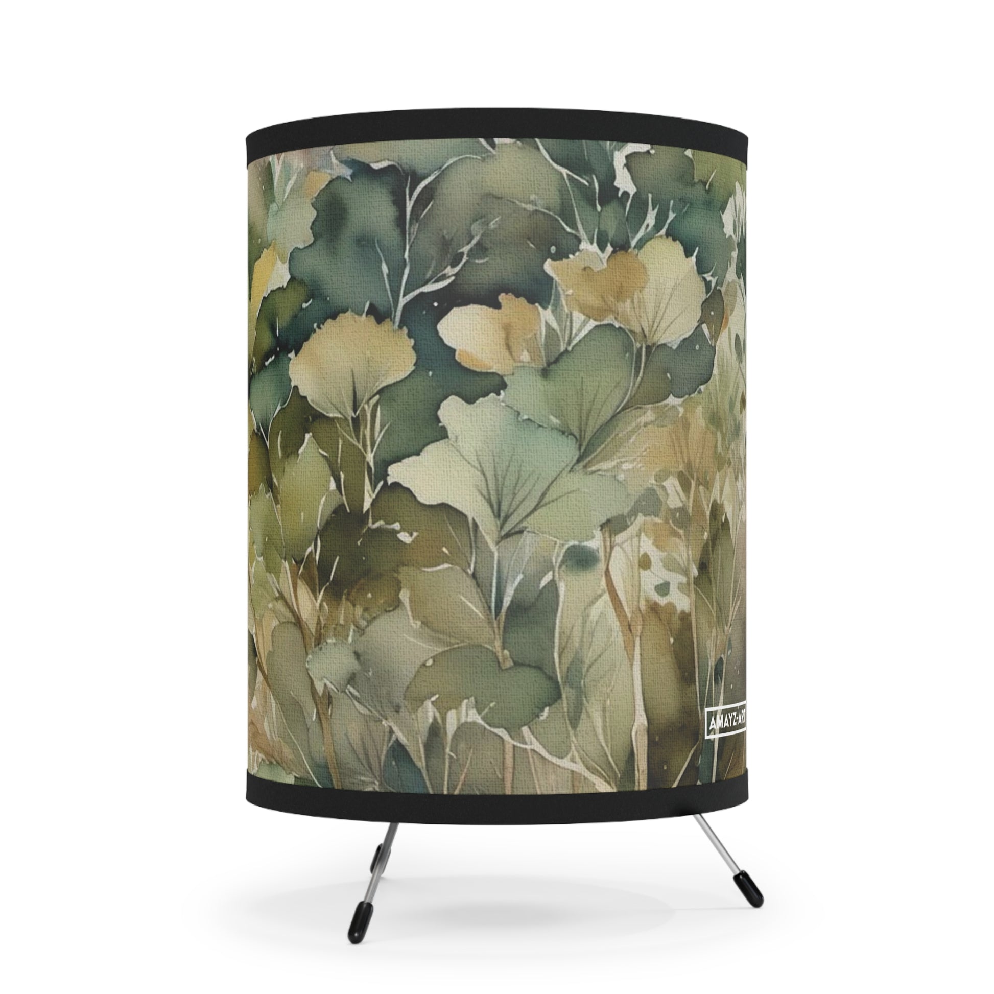Tripod Lamp featuring custom lampshade art by Brooke Lumbus. The galvanized steel tripod base delivers both high-end durability and a unique decorative touch. The lamp includes a type A plug with two pins, which makes it suitable for the sockets used in the USA and Canada.